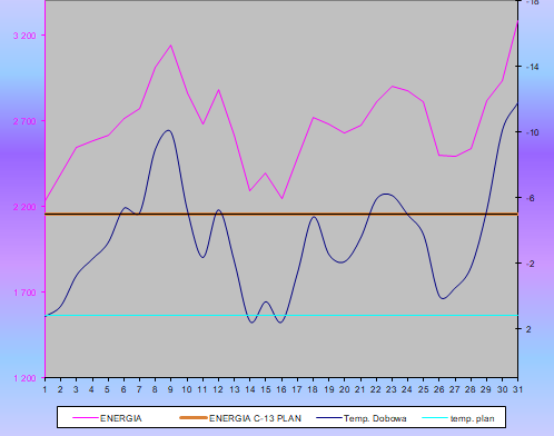 Zmiany produkcji, które odpowiadają zmianom zużycia energii cieplnej w styczniu przedstawiono na powyższym wykresie (PEC w Gnieźnie, dzięki zautomatyzowaniu i opomiarowaniu procesu produkcji, dostarczania i dystrybucji energii cieplnej, dostarcza tylko tyle energii jaka jest zużywana przez użytkowników).