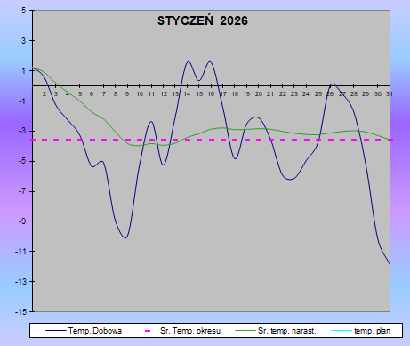 Najzimniejszym dniem w ubiegłym miesiącu okazał się 31 stycznia (temperatura dobowa -11,82ºC), natomiast najcieplej było 16 stycznia (temperatura dobowa +1,58ºC). Różnica temperatur między najzimniejszym a najcieplejszym dniem stycznia 2026 r. wyniosła 13,40 ºC.