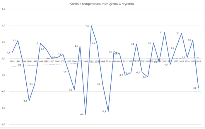 Średnie miesięczne temperatury w styczniu w latach 1993-2026 przedstawiono na poniższym wykresie.
