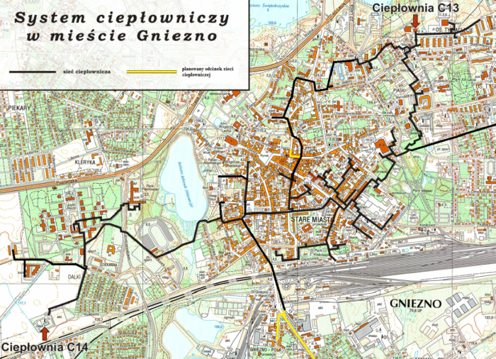 Na mapie przedstawiamy aktualny zasięg sieci ciepłowniczej w Gnieźnie, wraz z planowanymi inwestycjami.
