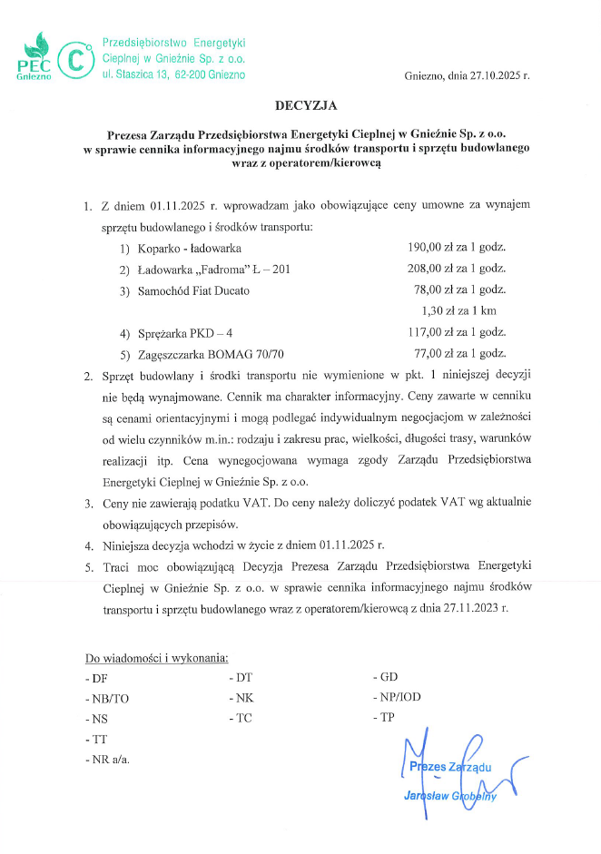 Decyzja Prezesa Zarządu PEC w Gnieźnie Sp. z o.o. w sprawie zbytu żużla paleniskowego z załadunkiem