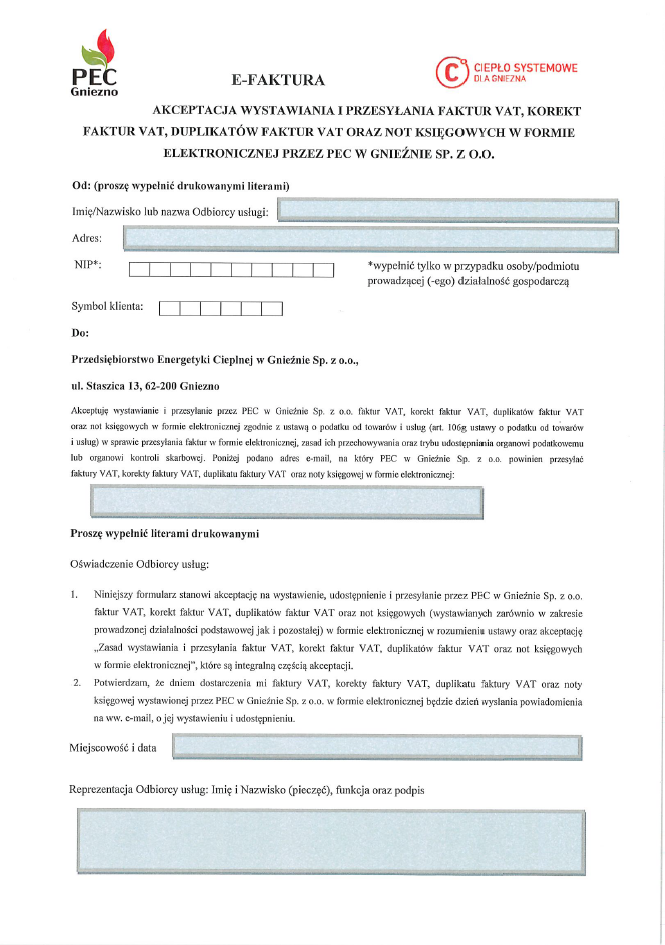 Pierwsza e-Faktura zostanie wysłana od kolejnego okresu rozliczeniowego po wpłynięciu poprawnie wypełnionego formularza.