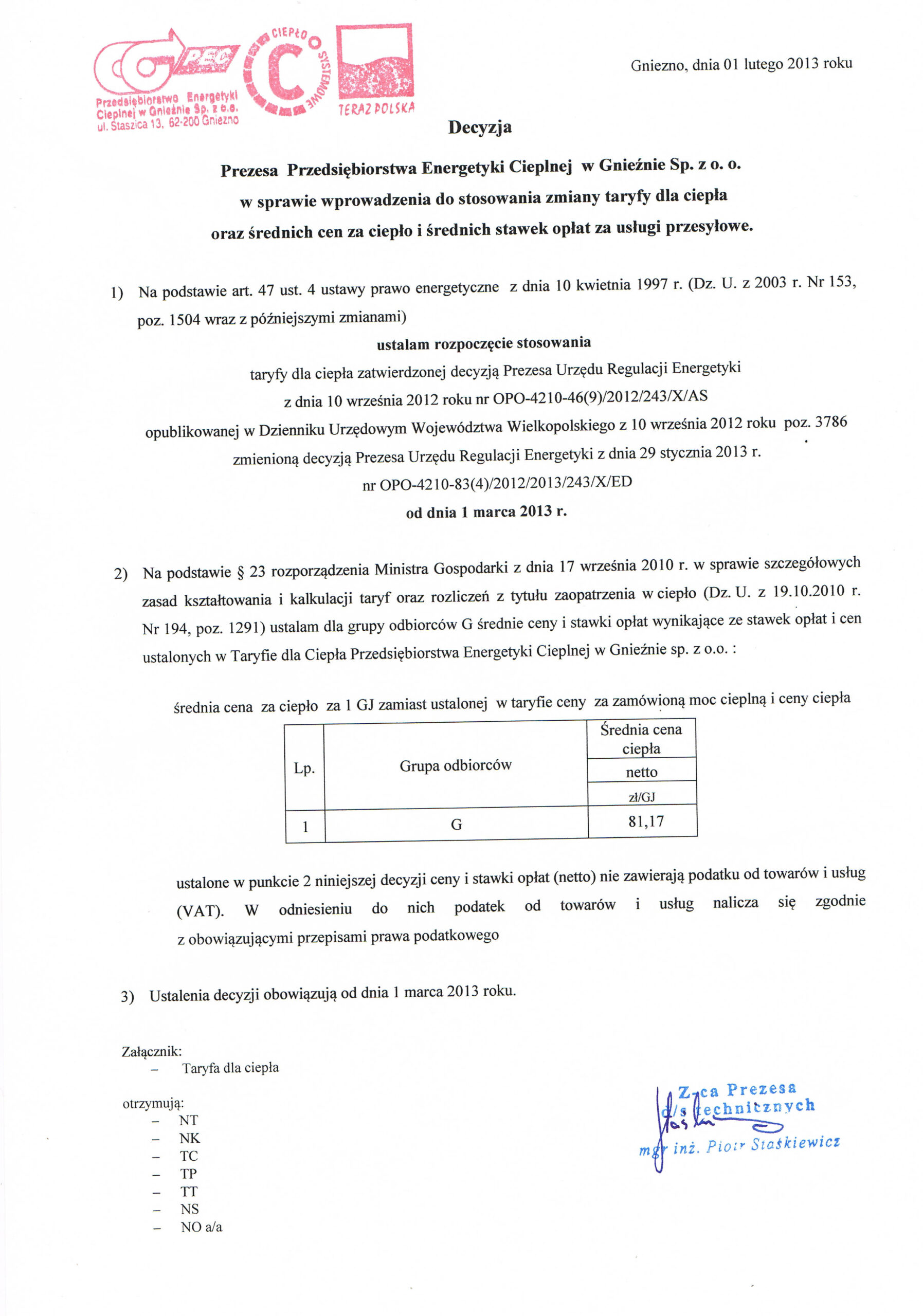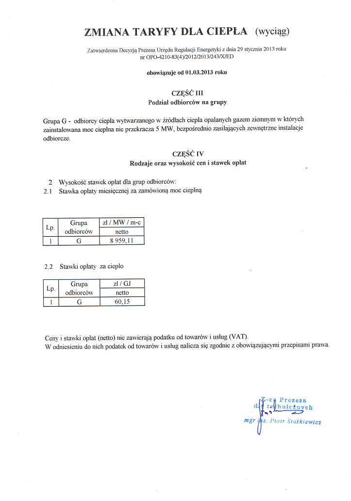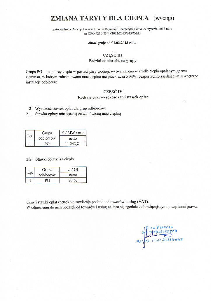 Poniższa Taryfa dla ciepła obowiązuje od dnia 01.03.2013 r.